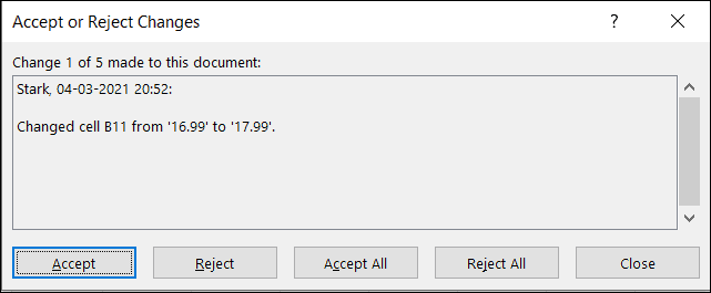 When you click Accept, the change is applied to the worksheet. If you choose Reject, the cell will revert to its previous value.