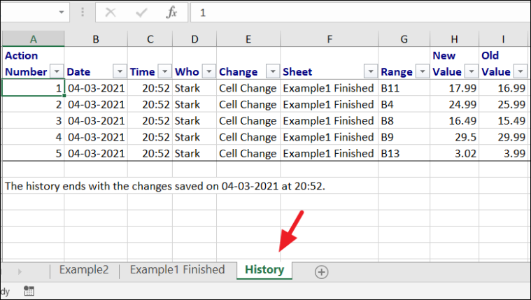 Excel will generate a new worksheet named History, containing a comprehensive list of all changes, including the cell references, original values, new values, who made the changes, and when they were made.