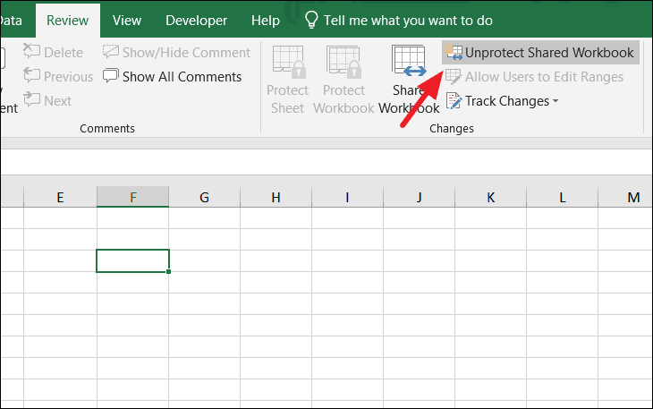 Step 1: Before turning off Track Changes, you need to unprotect the shared workbook. On the Review tab, click on Unprotect Shared Workbook.