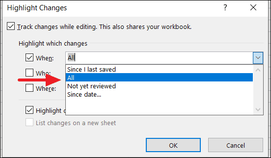 Step 3: Under the When section, you can specify the time frame for tracking changes. Options include Since I last saved, All, Not yet reviewed, or Since date for a specific date. Select All to track all changes.
