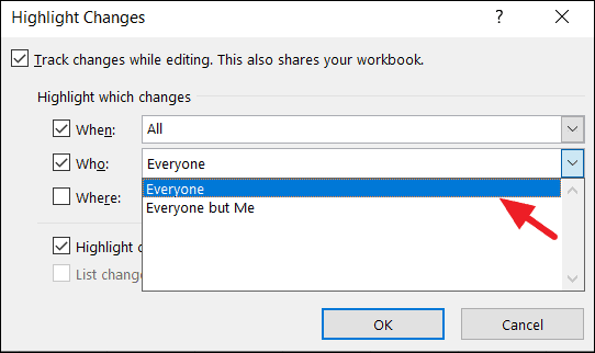 Step 4: In the Who field, select Everyone to track changes made by all users. Alternatively, you can choose to track changes made by specific individuals.