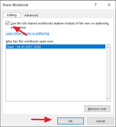 Step 8: In the Share Workbook dialog box, ensure that the option Use the old shared workbooks feature instead of the new co-authoring experience is checked, then click OK.