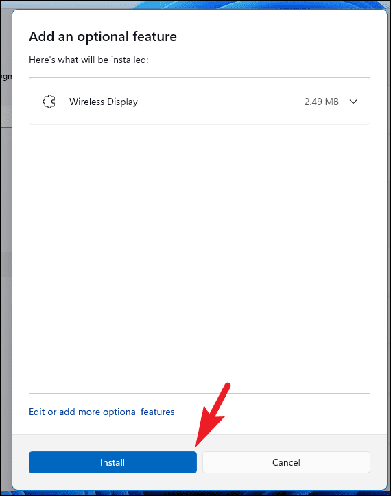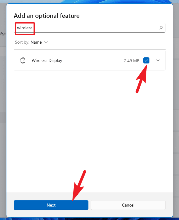 Step 6: In the search bar, type Wireless Display. Check the box next to it, then click Next and Install to add the feature.