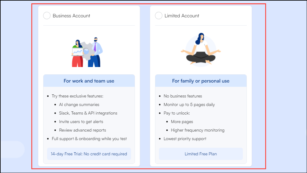 - Next, you will need to choose whether you want to sign up with a Business or a Limited account by clicking on the respective option.
