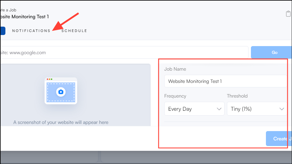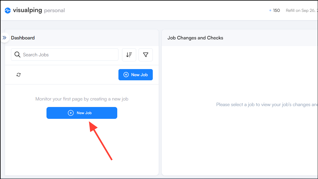 - Once you've created an account on the VisualPing.io website, you will see the dashboard with a tutorial that you can check out. Click on the 'New Job' button.
