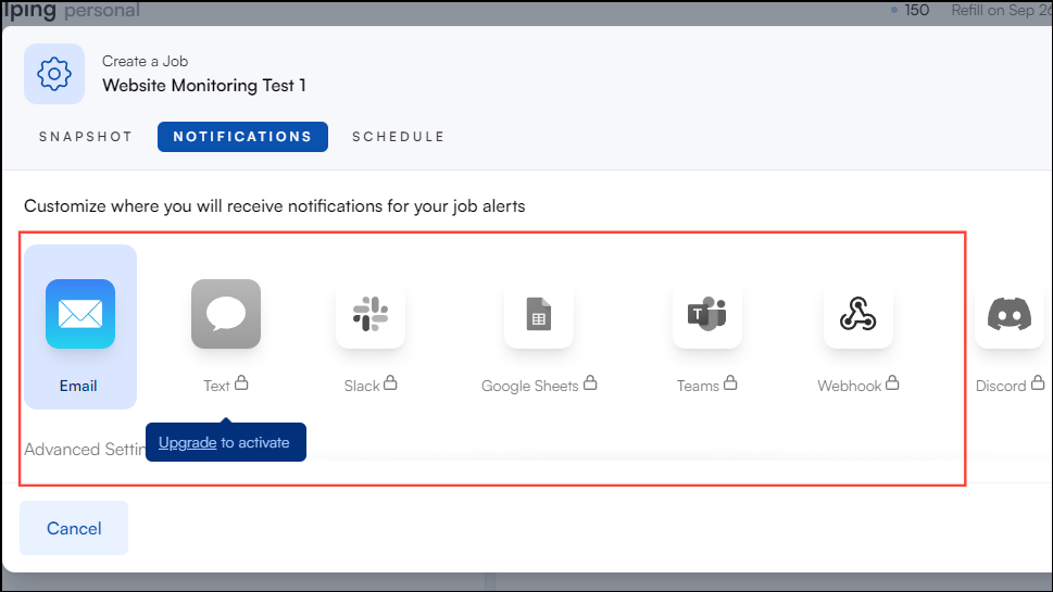 - Here you can choose how VisualPing.io will notify you of the changes you are tracking. Free users only get the email option, while paid ones have several options to choose from, such as Slack, text messages, Microsoft Teams, Google Sheets, etc.