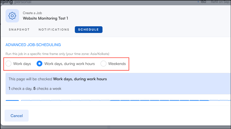 - Here, you can choose when to run the tracking job. You can choose between work days, work hours on work days, and weekends.