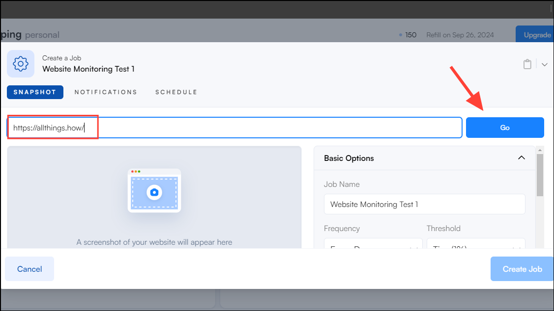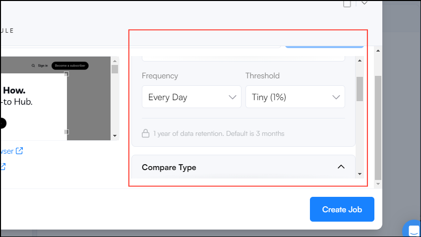 - Now, provide details for the tracking job in the 'Basic Options' section on the right. This lets you add a description, frequency of monitoring, threshold of changes to be monitored, and website areas to be monitored, like text and images.