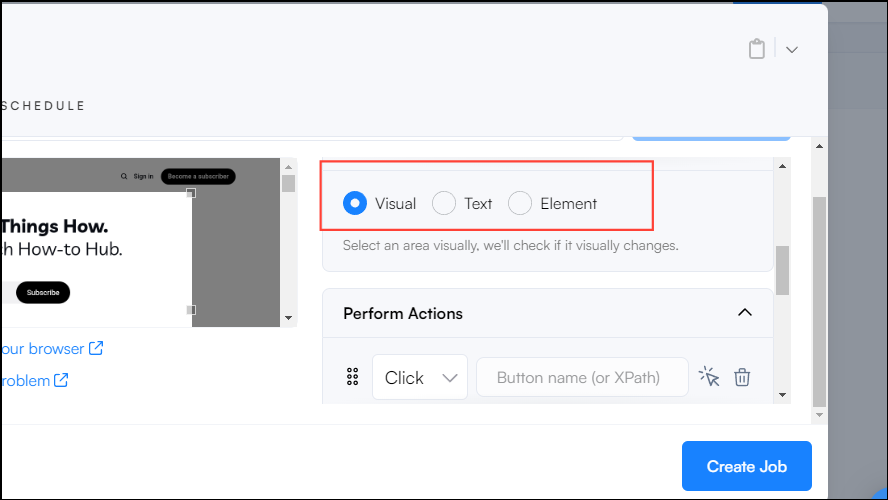 - You can set visual changes to 1% and text changes to any. You can also increase the threshold if you get many false positive alerts. Then choose the type of monitoring you want from between Visual, Text, and Element options.