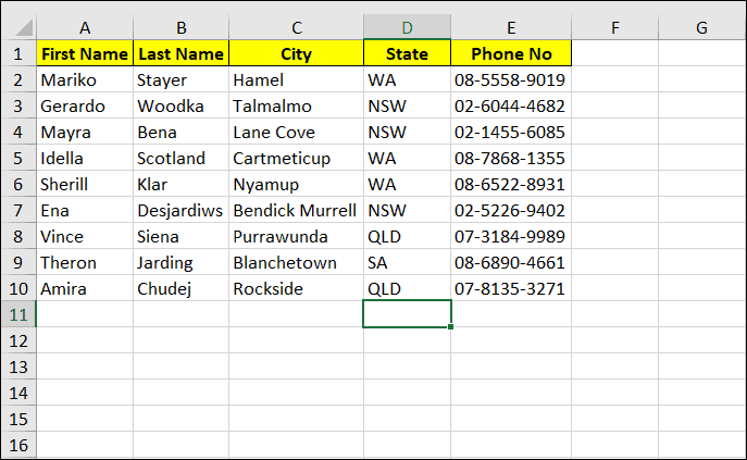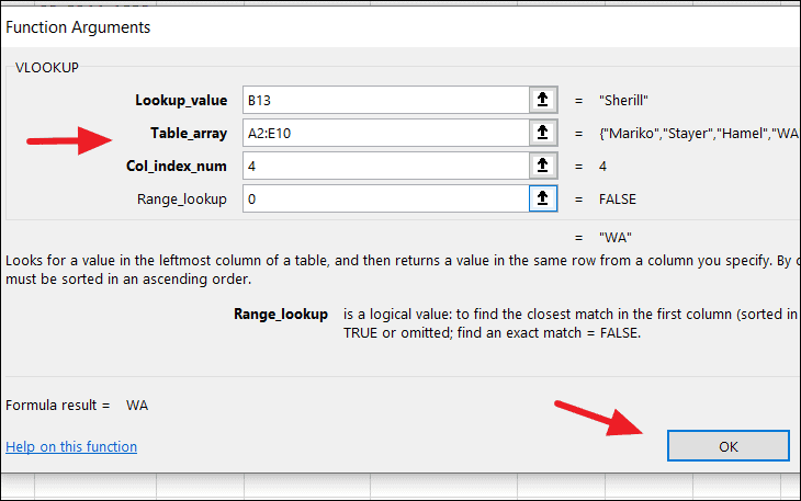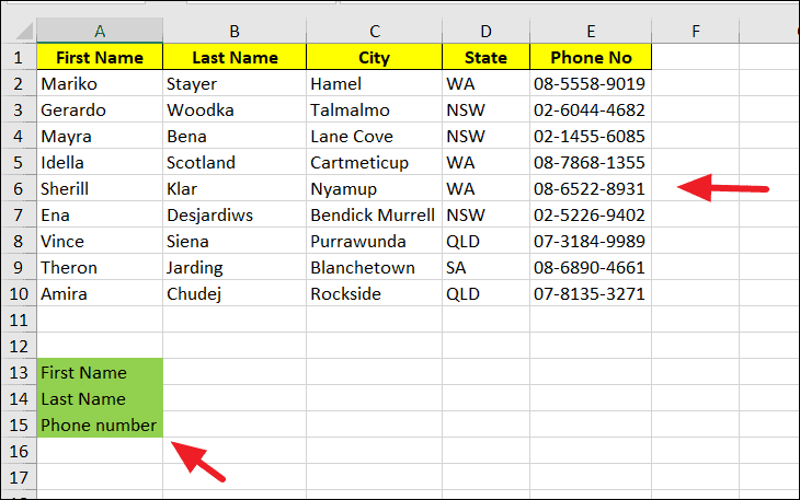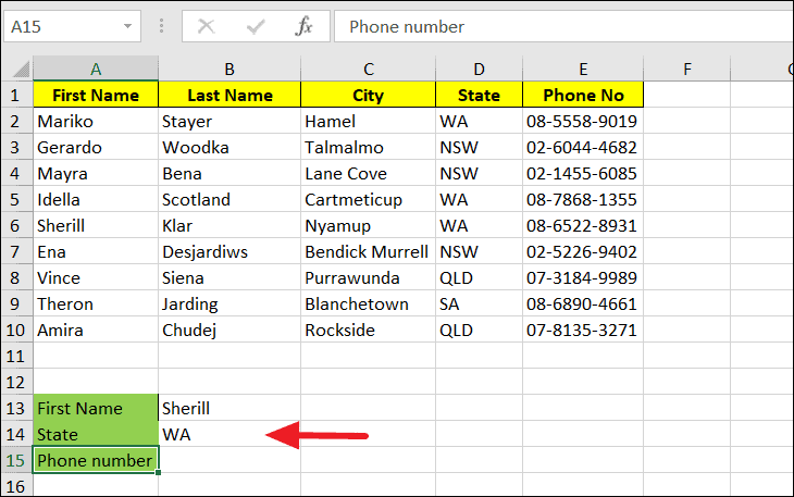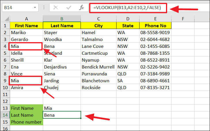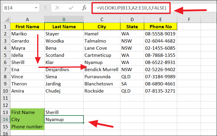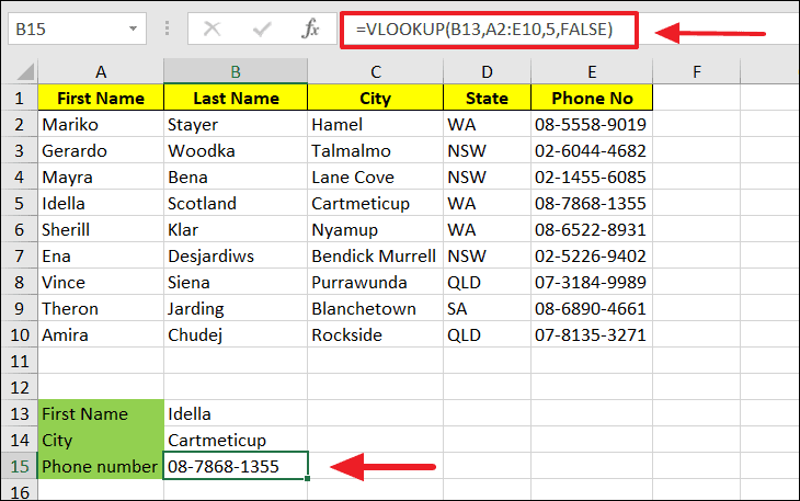 B13is the cell containing the lookup value "Ena".A2:E10is the range of the main table.5indicates the 5th column in the range, which contains the phone numbers.FALSEspecifies that we want an exact match.