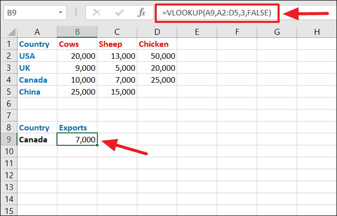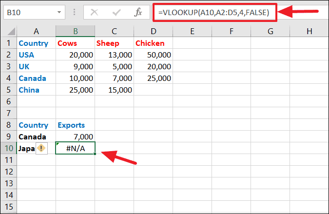 =VLOOKUP(A9, A2:D5, 3, FALSE)If the exact value is not found, VLOOKUP will return a #N/A error. For instance, if you're searching for "Japan" in a list that doesn't include it, the function will display an error.