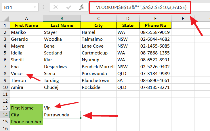 =VLOOKUP($B$13&"*", $A$2:$E$10, 3, FALSE)In this formula, if B13 contains "Vin", the function will search for any value that starts with "Vin" and return the corresponding data.