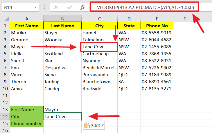 =VLOOKUP(B13, A2:E10, MATCH(A14, A1:E1, 0), 0)In this example, VLOOKUP searches for the first name "Mayra" and uses the MATCH function to find the column number for "City".