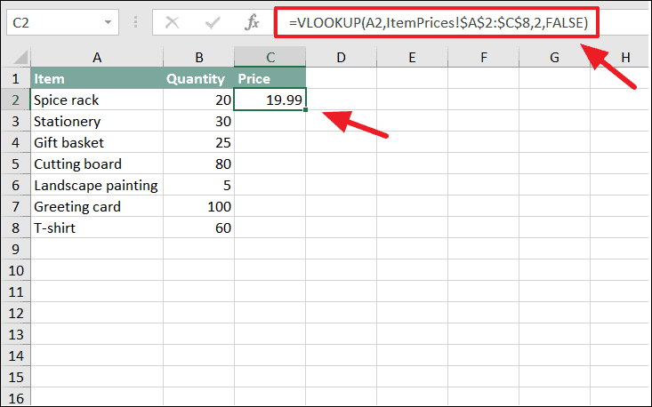 =VLOOKUP(A2, ItemPrices!$A$2:$C$8, 2, FALSE)Here, the function looks up the value in cell A2 on the current sheet and searches for it in the range $A$2:$C$8 on the ItemPrices sheet.