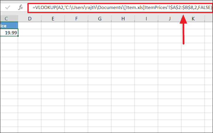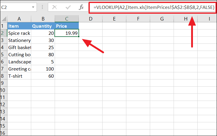 =VLOOKUP(A2, [Item.xls]ItemPrices!$A$2:$B$8, 2, FALSE)When setting up the formula, it's best to have both workbooks open. Navigate to the other workbook when selecting the table_array range to automatically include the correct path.