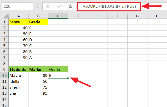 =VLOOKUP(B10, A2:B7, 2, TRUE)For example, when assigning grades based on score ranges, an approximate match is suitable. If a student's score isn't an exact match in the table, VLOOKUP will find the next largest value that's less than the lookup value.