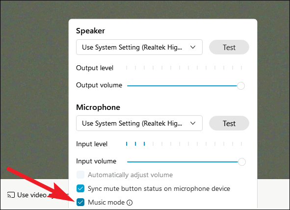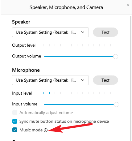 Then, under the Microphone settings, click on the box next to ‘Music Mode’ to enable it. Uncheck the box for ‘Music Mode’ to disable it, and automatic audio enhancement will resume again.