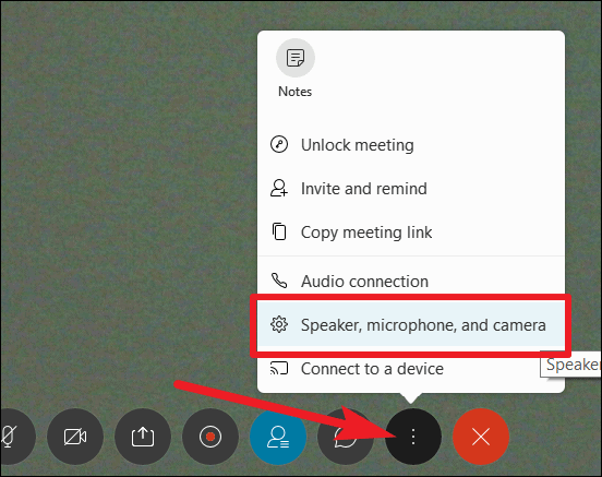 If you’re already in the meeting, click on the ‘More options’ icon (three dots) on the meeting toolbar, and select ‘Speaker, Microphone, and Camera’ from the menu.