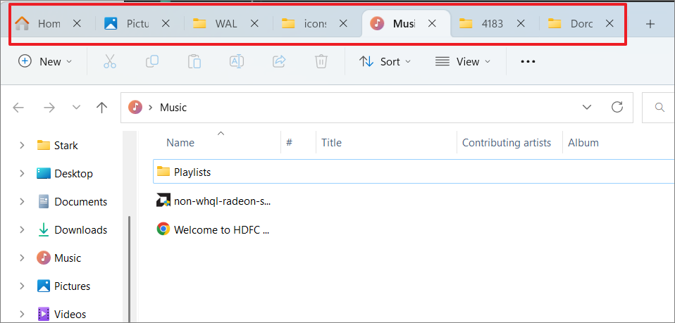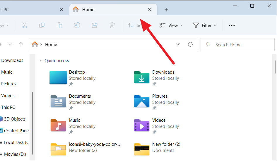 To open a new tab from the Title bar, click the Plus (+) button located next to the existing tabs. This action opens a new tab displaying the Home screen of File Explorer, where you can access Quick Access, Favorites, and recent items.