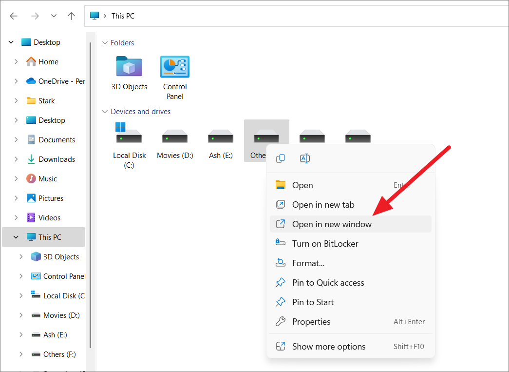 To open a folder or drive in a new window, navigate to it, right-click, and select Open in new window from the context menu.