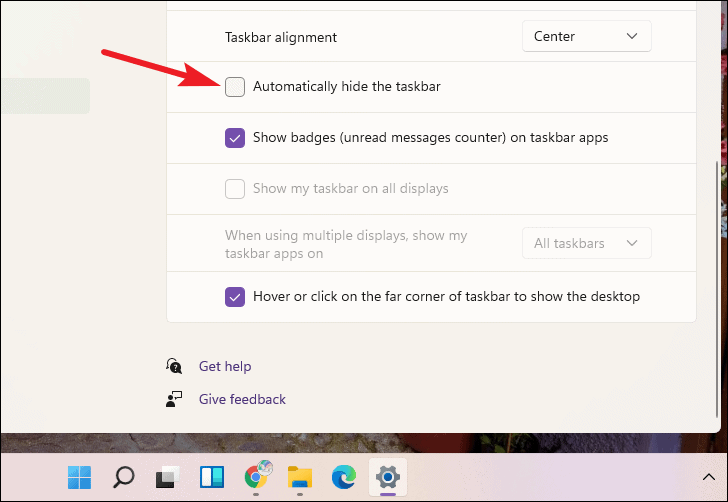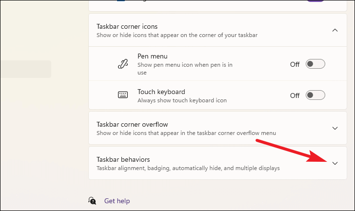 - In the Taskbar settings window, expand the Taskbar behaviors section.