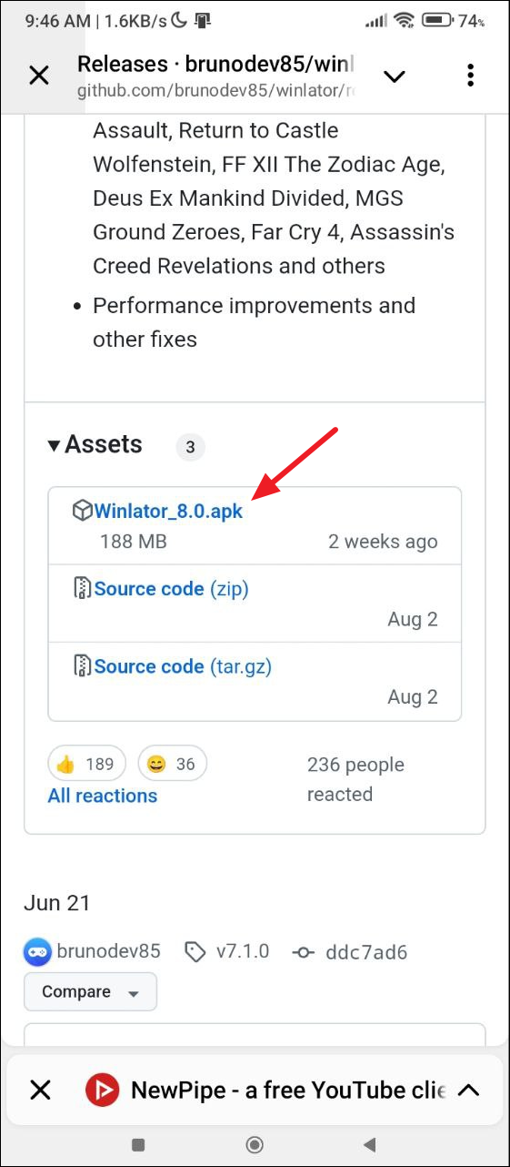 - Visit the GitHub page where the Winlator APK is located and tap on the APK to download it.