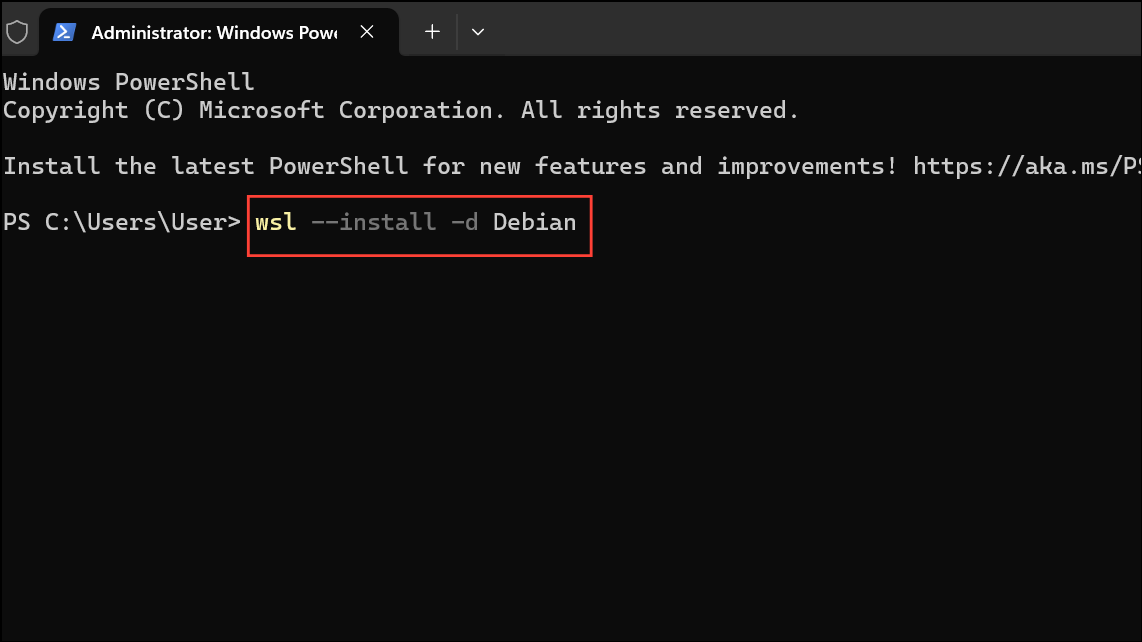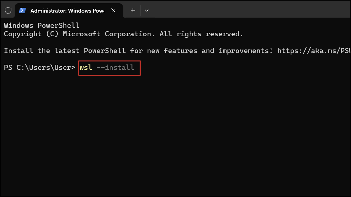 Step 2: Enter the following command to install WSL and the default Ubuntu Linux distribution: