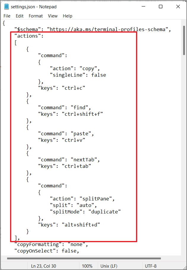 settings.json file is the main configuration file that contains VS code settings and other configuration information of the Windows Terminal application. It can be easily modified to suit your needs. You can modify any key binding/shortcuts through the ‘actions’ property (formerly keybindings) in the ‘settings.json’ file.