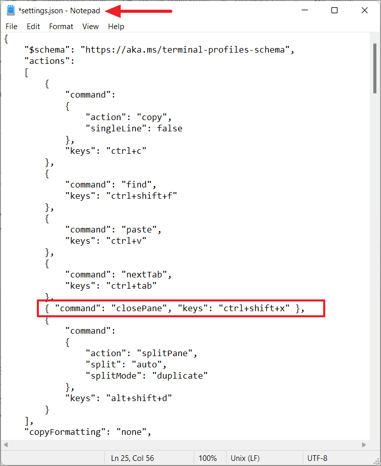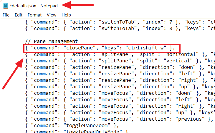 For example, if you want to modify the hotkeys for ‘closing the current pane’ to Ctrl+Shift+X instead of the default Ctrl+Shift+W, then just replace the default shortcut keys with your shortcut. To do that, here we are copying the ‘closepane’ object from the ‘default.json’ file.