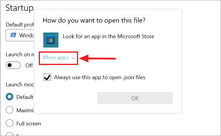 If this is the first time you’re opening a JSON file, it will ask you ‘How do you want to open this file?’ (With which app). You can open and edit JSON files in any text editor. So, select the ‘More apps ↓’ option to choose your text editor.