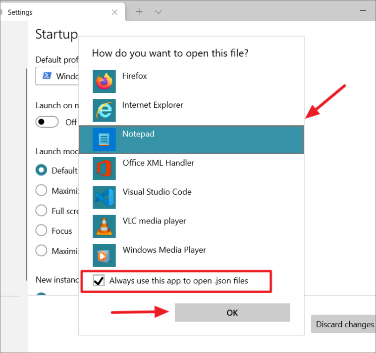 Then scroll down, select a text editor (the inbuilt Notepad works fine), and click ‘OK’. You can also check the ‘Alway use this app to open .json files’ box to make this app the default app for JSON files.
