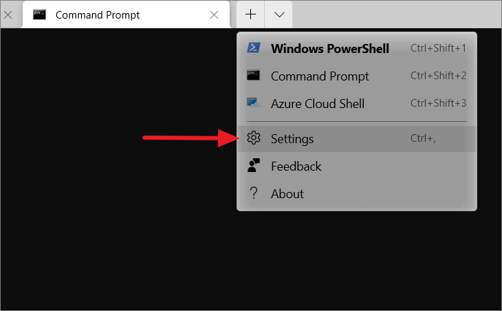 To access the ‘settings.json’ file, click the drop-down menu next to the plus (+) button at the top of the Windows Terminal window, and select ‘Settings’.