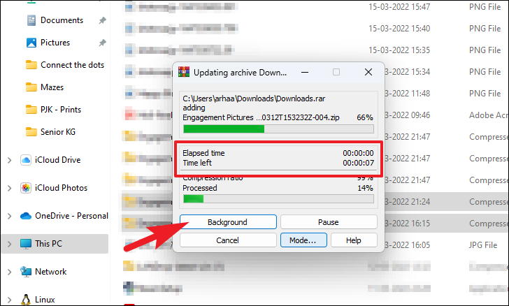 It might take several minutes to create an archive if the files are large enough; wait patiently till WinRAR does that. You can also click on the ‘Background’ button to archive the files in the background while you use your computer for other purposes.