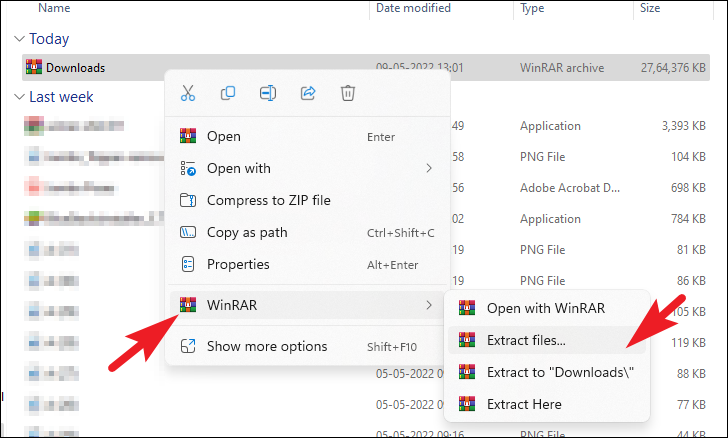 First, head to the zip file that you wish to unzip and right-click it to reveal the context menu. Then, from the context menu, hover over the ‘WinRAR’ file to open the sub-menu and click on the ‘Extract files’ option to continue. This will open a separate window on your screen.
