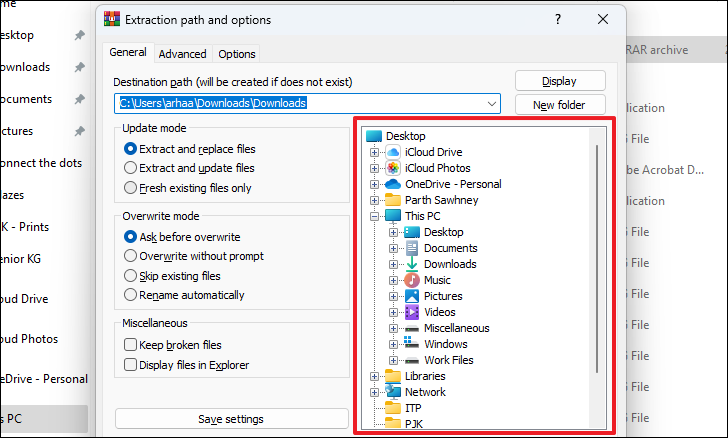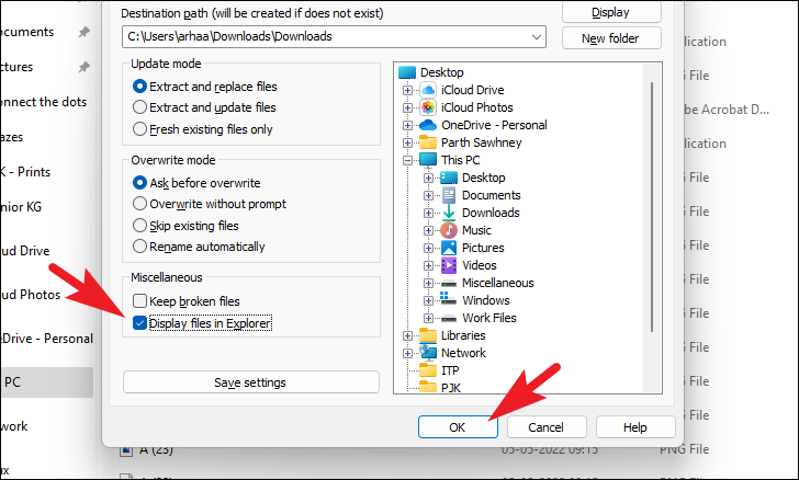 You can also set WinRAR to automatically open the directory once the extraction process is complete by clicking on the checkbox preceding the ‘Display files in Explorer’ option present under the ‘Miscellaneous’ section. Once you have the preferences as per your requirement, click on the ‘OK’ button present at the bottom right section to start extracting the files.