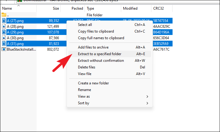Then, select the file that you wish to extract. In case there are multiple files, press and hold the Ctrl key on your keyboard while selecting the files. Once selected, right-click on one of the selected files to reveal the context menu. Then, click on the ‘Extract to a specified folder’ option. You can also use the Alt + E keyboard shortcut to perform this action without opening the context menu. Either way, a separate window will open on your screen.