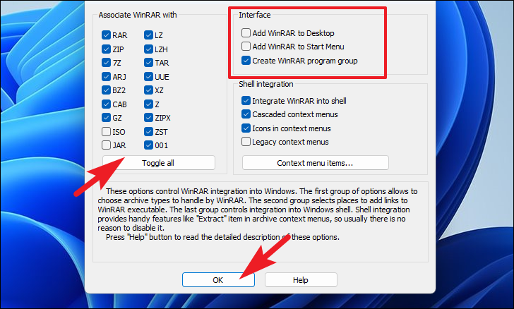 Then, on the setup screen of the installer, click on the ‘Toggle all’ button present under the ‘Associate WinRAR with’ section to open all supported file types using WinRAR. Next, if you wish to have a Desktop shortcut to WinRAR, click on the checkbox preceding the ‘Add WinRAR to Desktop’ option. After that, click on the ‘OK’ button to proceed.