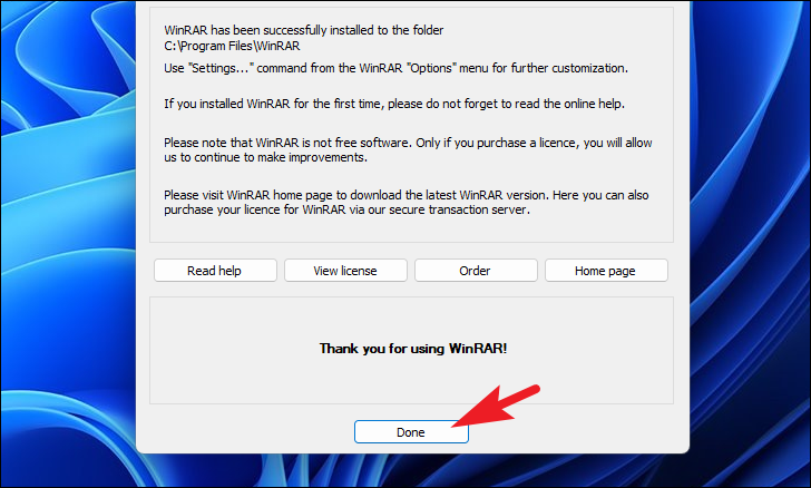 On the next screen, click on the ‘Done’ button to close the window and finish the installation process of WinRAR.
