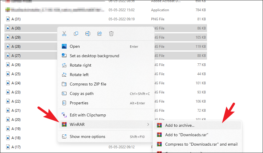 First, head to the file/ group of files that you wish to compress. Then, to select multiple files at a single time, Press CTRL on your keyboard and click on the files using the left mouse button. After that, press the right mouse button by keeping the cursor hovering over any of the selected files to reveal the context menu. Next, hover over the ‘WinRAR’ option to expand it and then select the ‘Add to archive’ option to continue. This will open a WinRAR window on your screen.