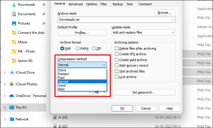Next, click on the dropdown menu present under the ‘Compression method’ field. Here, you can either choose the ‘Fastest’ method that will create an archive of your selected files/folders in very less time but won’t offer you much compression. At the same time, if you select the ‘Best’ option will offer you exceptional compression but will do it rather slowly. Hence, according to your requirement and convenience select one of the options.