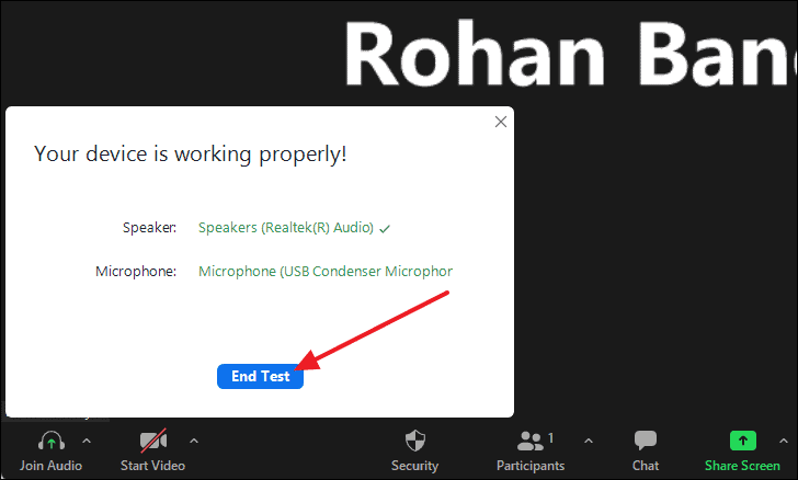 - When the meeting starts, a Join Audio window will appear. Click on Test Speaker and Microphone to ensure your audio devices are working properly.