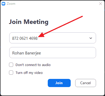 - Enter the Meeting ID and your name. Optionally, check the boxes for Do not connect to audio and Turn off my video if desired.