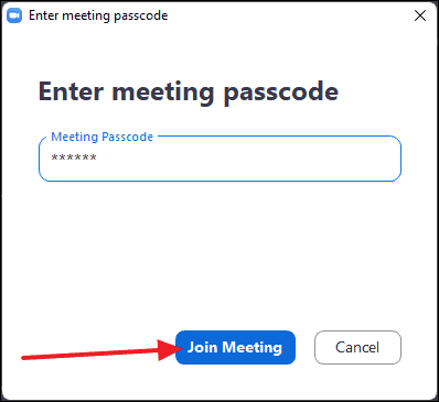 - Enter the meeting passcode when prompted and click Join Meeting.