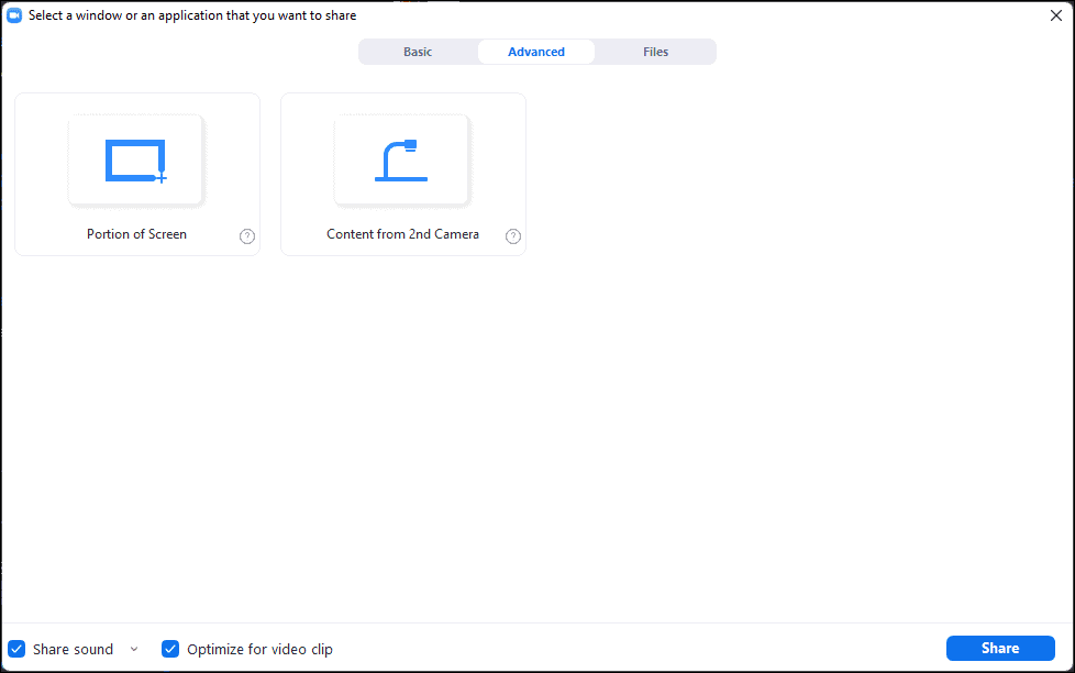 - Optionally, switch to the Advanced tab to share a portion of your screen or content from a secondary camera.