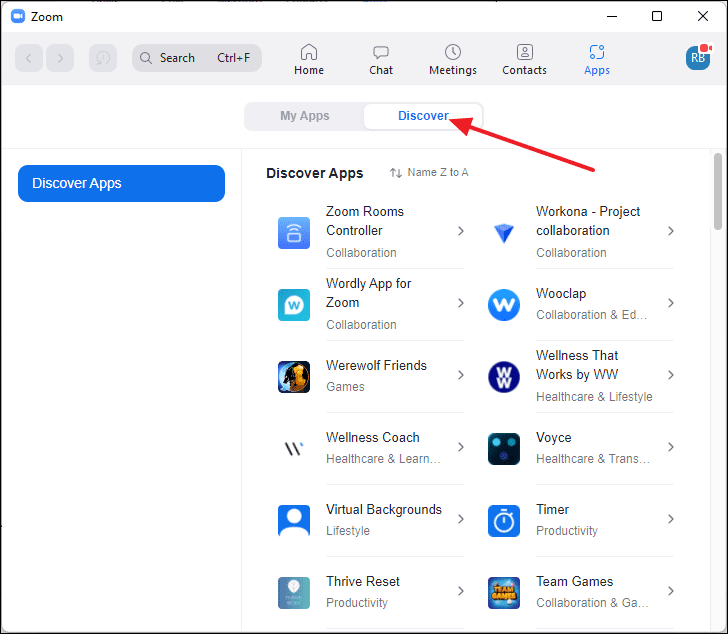 - In the Zoom client, click on the Apps tab.