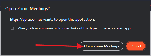- When prompted, click Open Zoom Meetings to return to the Zoom client.