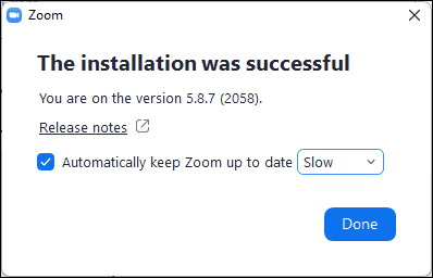 - After the installation completes, you will see a confirmation window. To enable automatic updates, check the box next to Automatically keep Zoom up to date and choose Slow or Fast updates. Click on Done to finish.