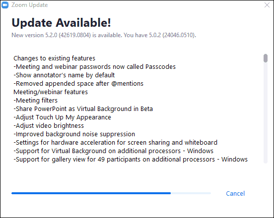 Zoom will check for the latest update and begin downloading it automatically if it’s available. Once the latest version downloads, click on the ‘Update’ button to restart and update the Zoom meeting client.