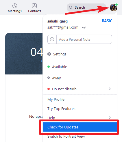 Video filters are part of the latest update to Zoom. So you need to update to Zoom version 5.2 to be able to use these. Open your Zoom desktop client, click on your Profile icon, and then select ‘Check for Updates’ from the menu.