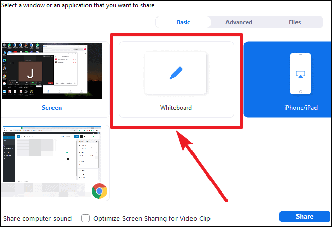 One of the options in the available screens to share will be ‘Whiteboard’. Select it, and click on ‘Share’.